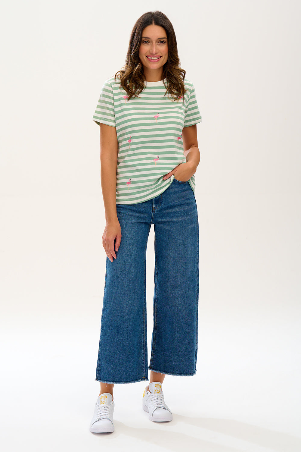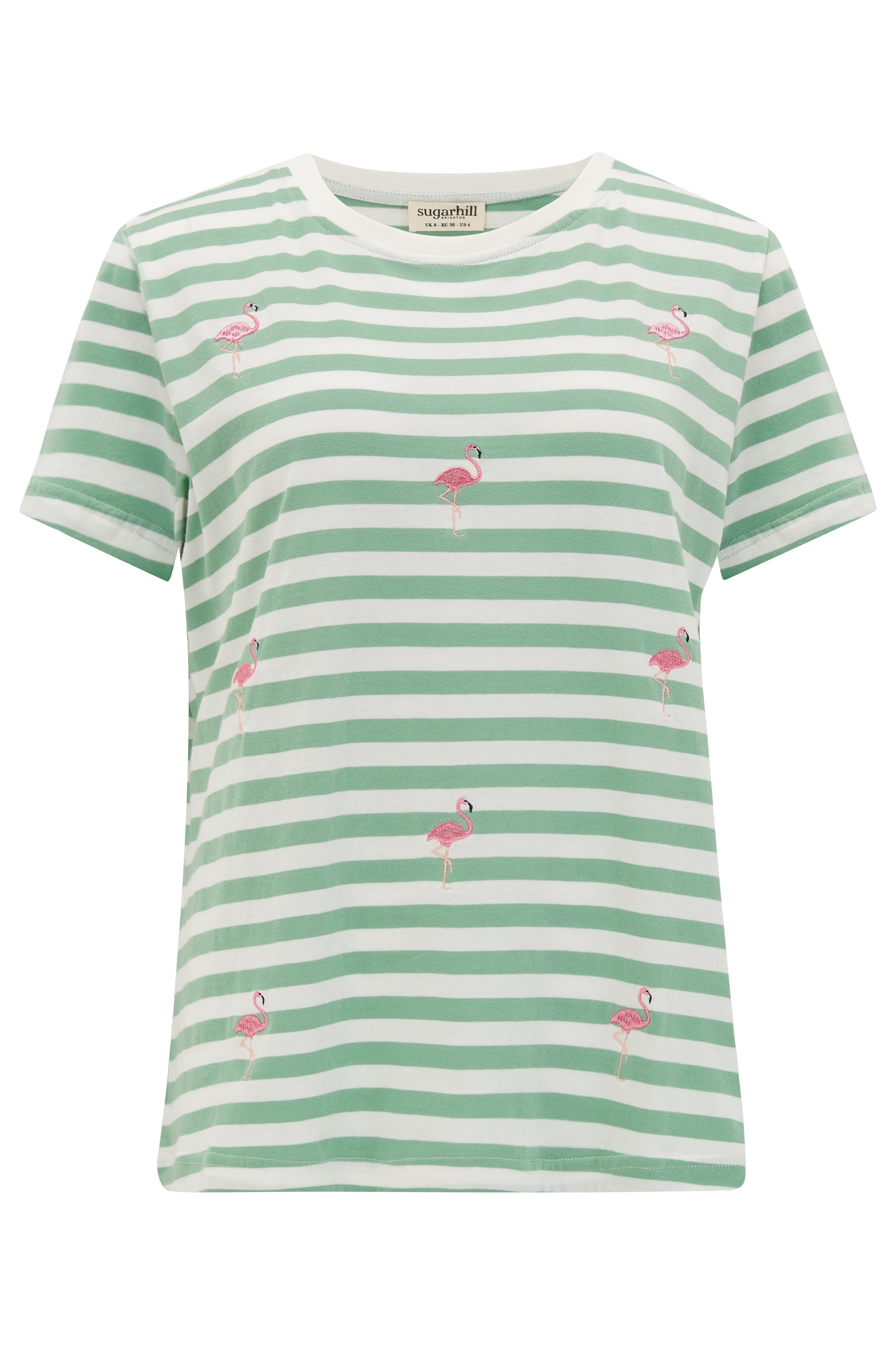 Maggie T-shirt - Off-White/Green, Flamingo Embroidery