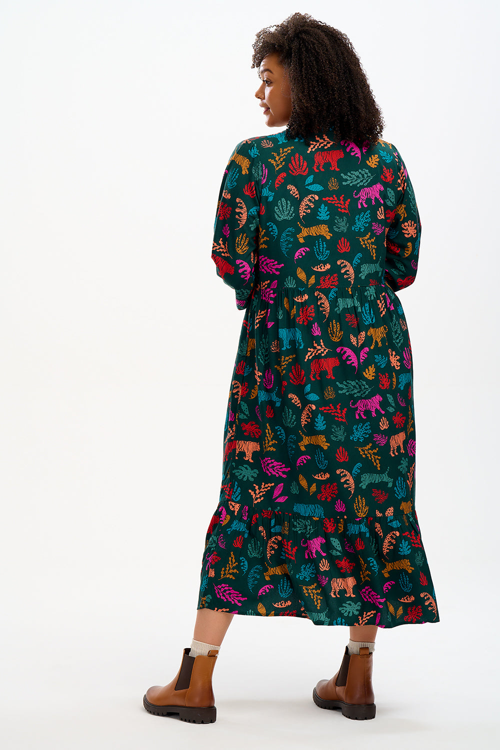 The Annalise Midi Smock Dress is designed in a relaxed smock silhouette with a flattering V-neckline, gathered waist, and tiered midi skirt. Featuring long blouson sleeves with elasticated cuffs and practical side seam pockets, this dress blends comfort and style effortlessly. The dark green base is adorned with bold multicoloured tiger cutouts and leafy accents, adding a playful twist to this easy-to-wear piece.