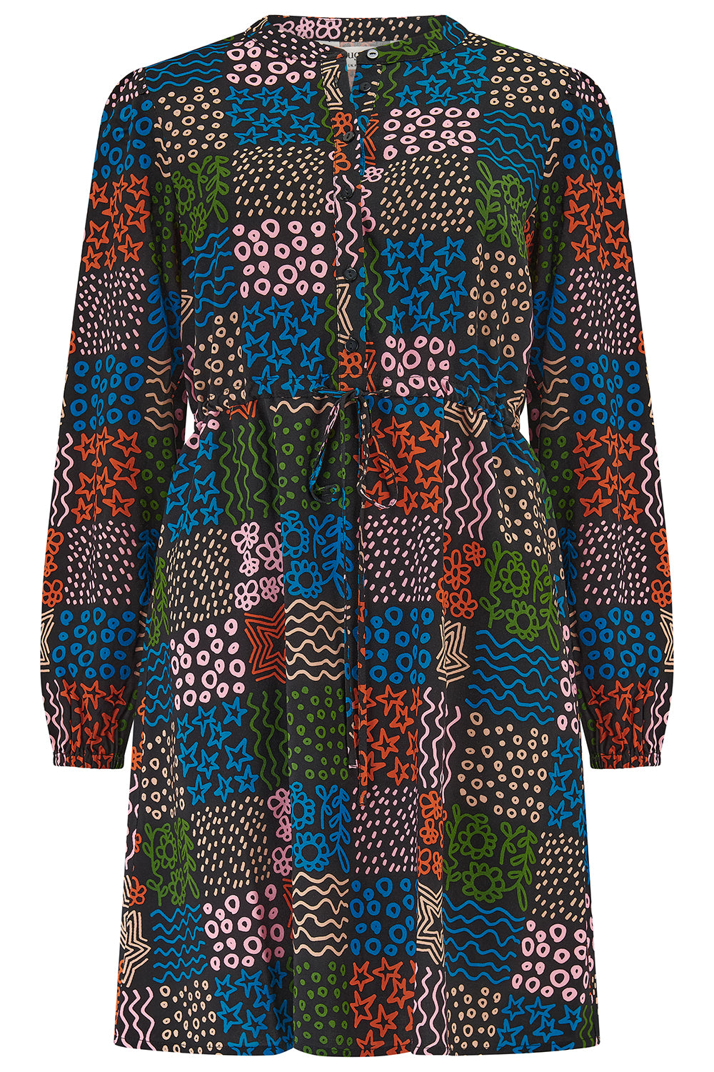 The Flora Dress is a fresh update to our classic shirt dress silhouette. Designed with a grandad collar, button-up front, and a flattering drawstring belt, it offers a versatile fit that can be cinched at the waist or worn loose. The skirt falls to a breezy mini length, making it perfect for everyday wear or dressed-up occasions. Crafted from sustainable fabric, the Flora showcases our bold Patchwork Doodle print – a lively mix of hand-drawn stars, flowers, dots, and squiggles arranged in colourful patchwork on a sleek black base. A playful yet refined piece you’ll love to wear on repeat.