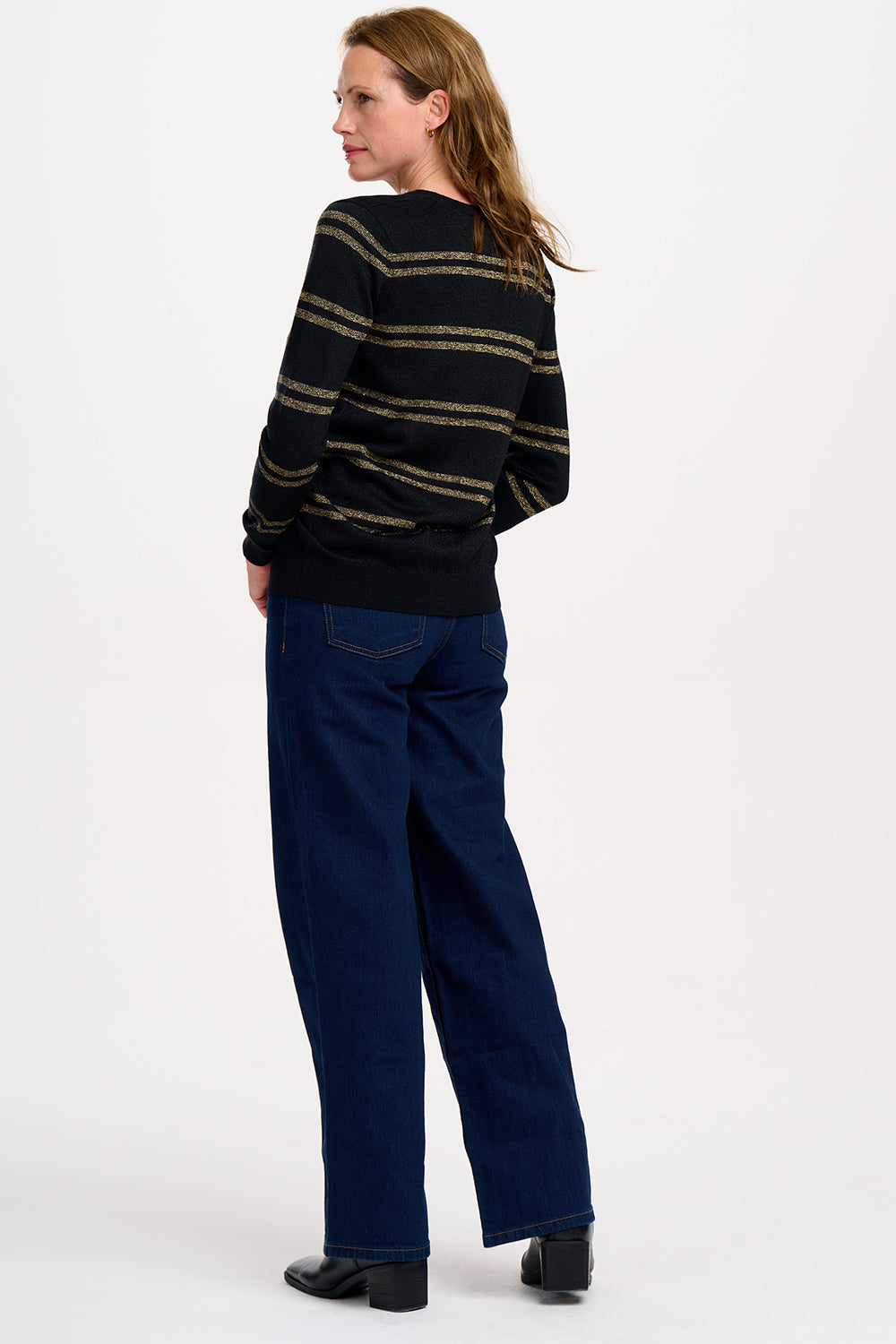 Meet the Marcella Jumper — where subtle sparkle meets effortless style. This lightweight, cotton-mix knit combines the semi-fitted shape of our bestselling Astrid with a flattering V-neckline. Finished with bronze stripes that add a playful twist to its shimmer-infused black base, the Marcella offers the perfect blend of comfort, polish, and personality — ideal for day-to-night dressing.