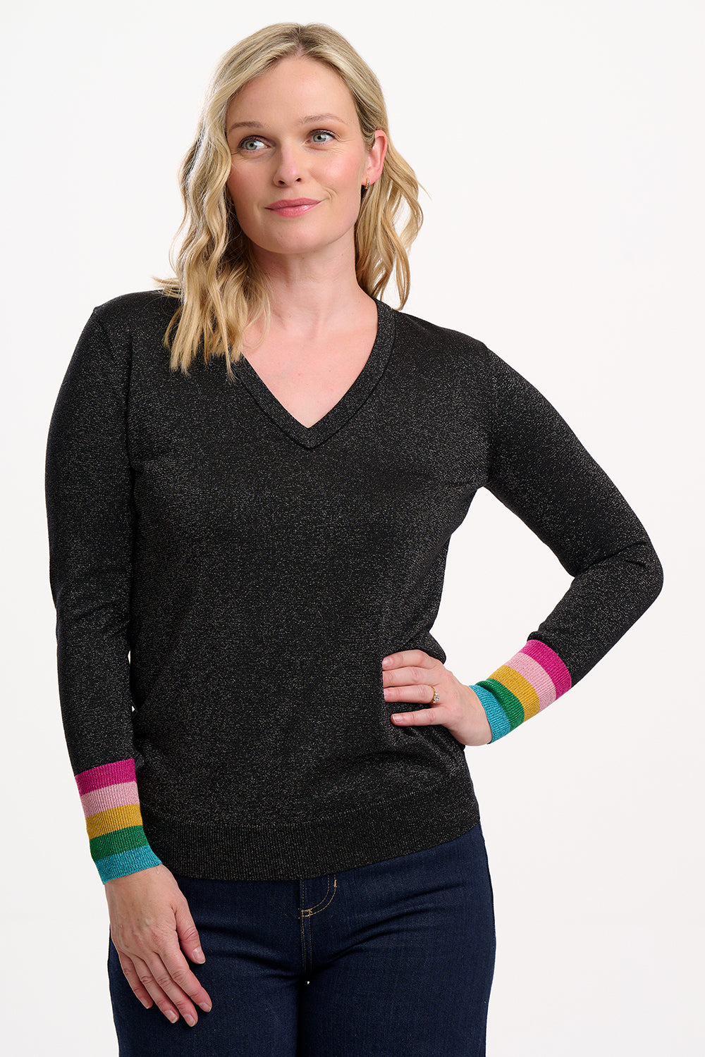 Meet the Marcella Jumper — where subtle sparkle meets effortless style. This lightweight, cotton-mix knit combines the semi-fitted shape of our bestselling Astrid with a flattering V-neckline. Finished with colourful striped cuffs that add a playful twist to its shimmer-infused black base, the Marcella offers the perfect blend of comfort, polish, and personality — ideal for day-to-night dressing.