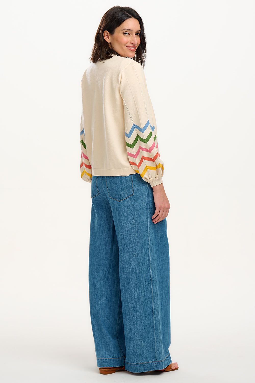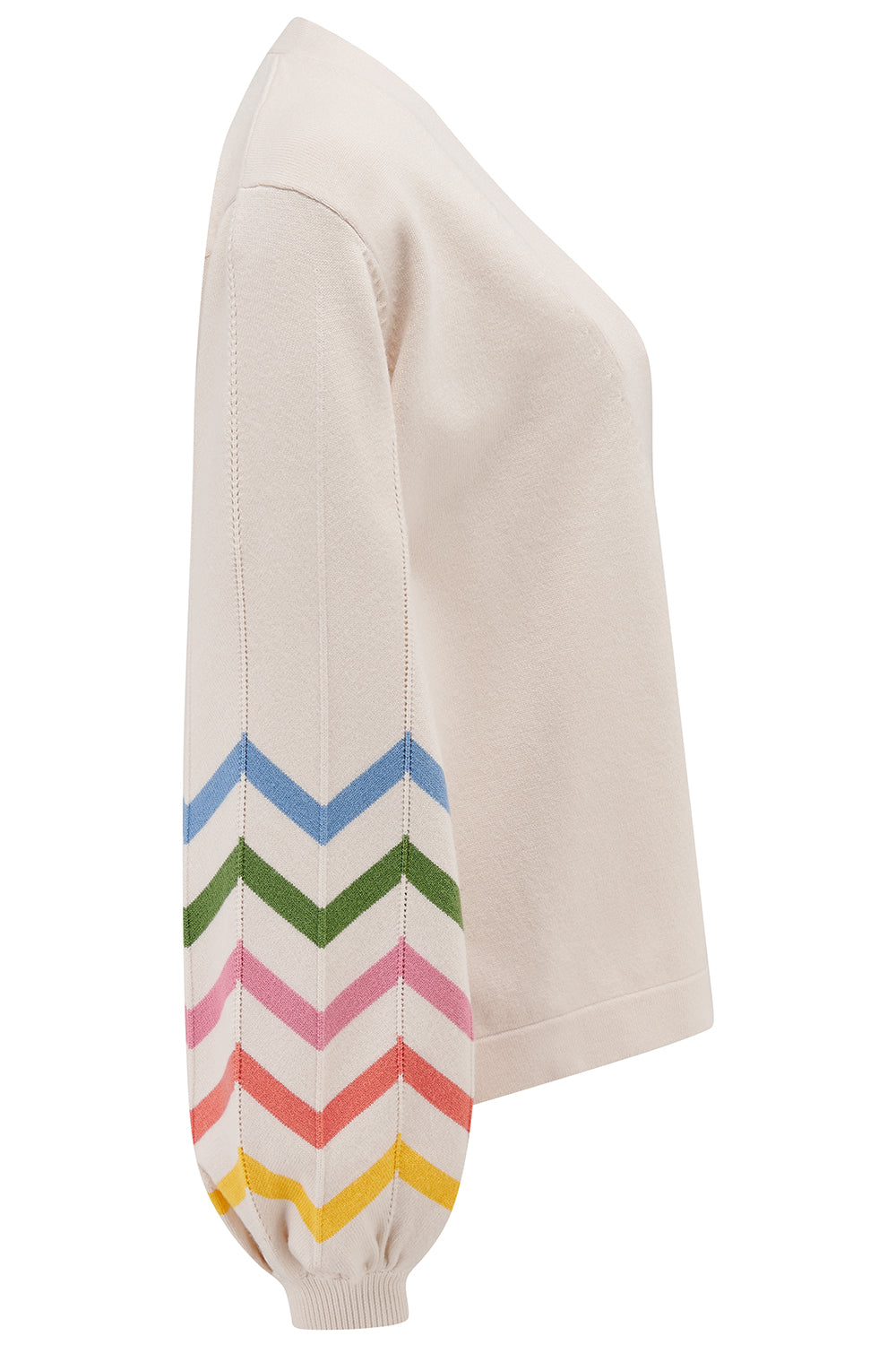Meet the newest member of the Yvette family — a shorter, easier, throw-on version of our bestselling cardigan. This relaxed, open-front knit has no fastenings for an effortless, laid-back feel, perfect for layering over dresses and tees alike. The standout feature? Its joyful chevron stripes in blue, green, pink, orange and yellow that wrap around the sleeves, adding a pop of colour to brighten any outfit.