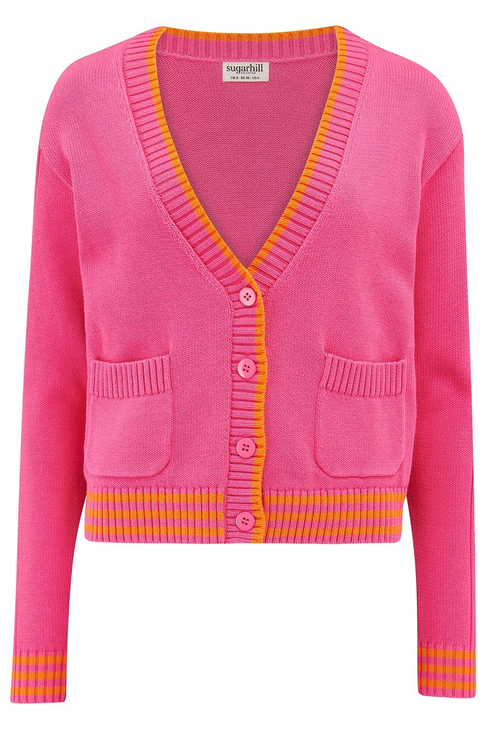 This vibrant V-neck cardigan from Sugarhill Brighton is crafted from 100% cotton for a soft, breathable feel that’s perfect for everyday layering. Designed in a bold pink hue with contrasting stripe details along the neckline, hem and cuffs, it brings a playful pop of colour to any outfit. Finished with a button-through front and practical patch pockets, it’s an easy-to-wear knit that works just as well over dresses as it does with jeans and tees.