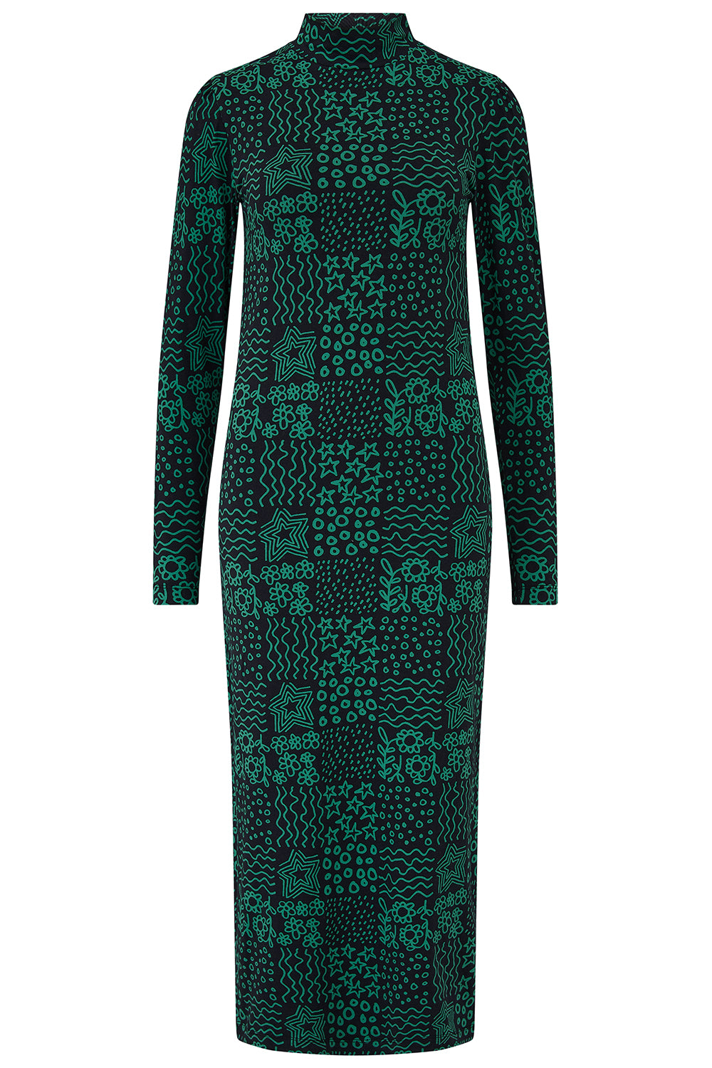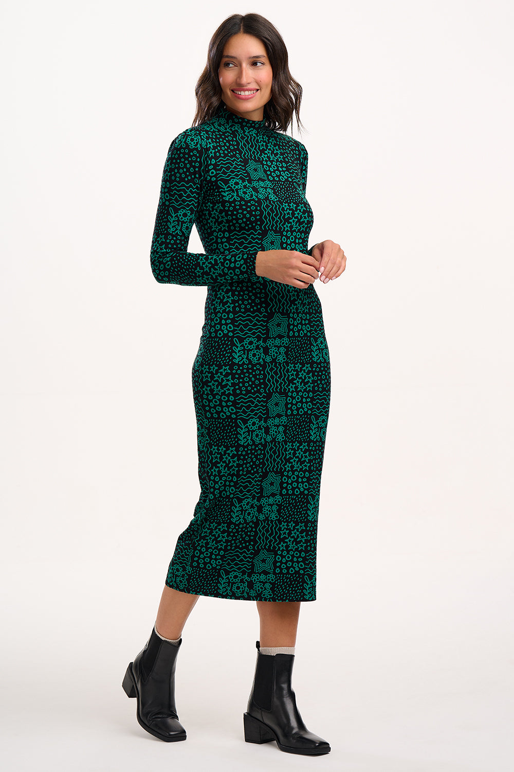 Introducing the Taliah Dress – a sleek, figure-skimming midi dress designed with long sleeves and a chic roll neck. Crafted from the same soft, comfortable fabric as our bestselling Annika tops, this style offers the perfect balance of stretch and structure. The Taliah showcases our Green Patchwork Doodle print, a hand-drawn design of stars, flowers, waves, and dots in bold green against a timeless black background. Effortlessly versatile, this dress transitions seamlessly from day to night.