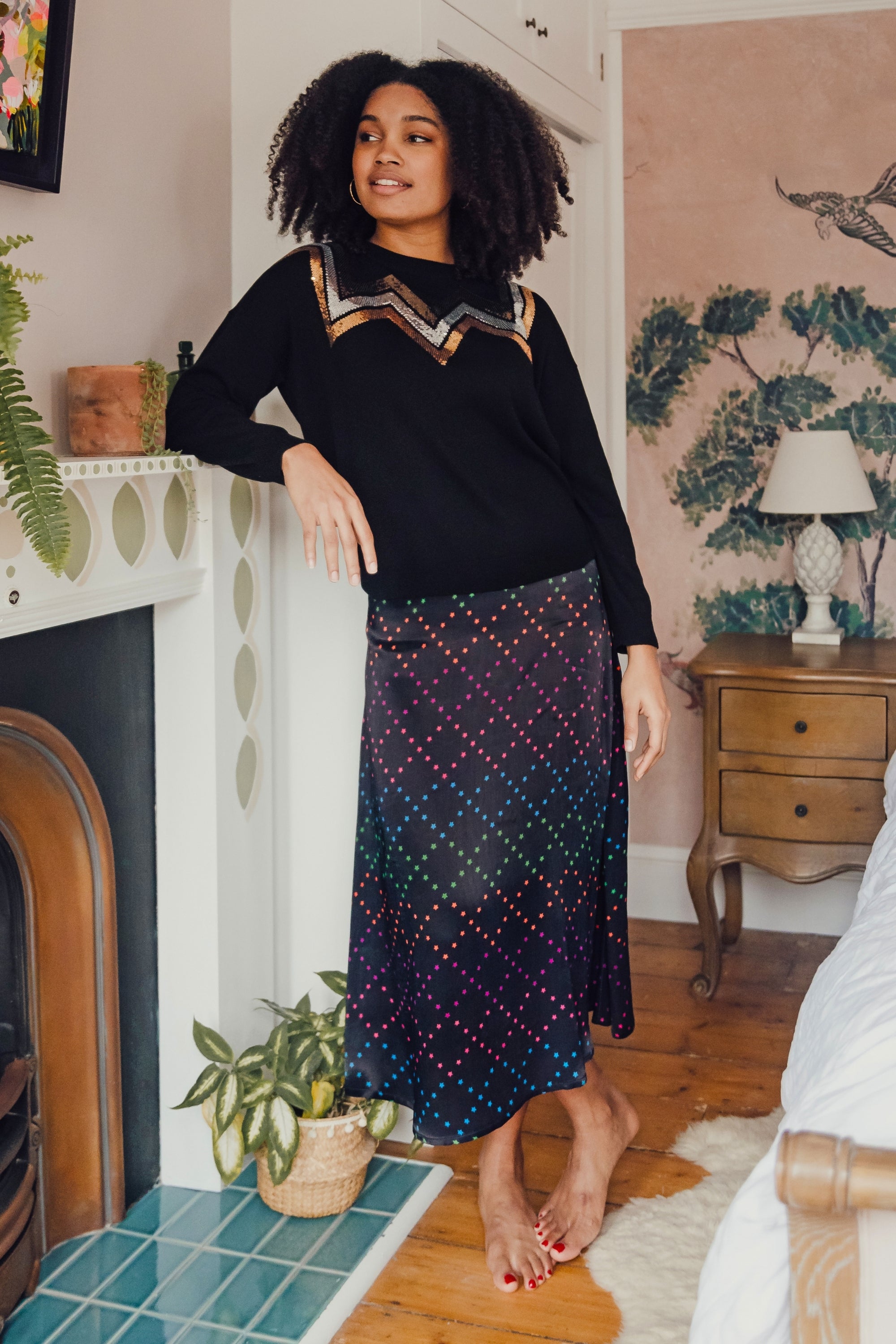 The Anjali Jumper blends comfort with a touch of sparkle. Designed with a relaxed fit, this mid-hip knit features ribbed trims and a round neckline for easy wear. Shimmering sequin band against a black base, adding a festive feel that transitions effortlessly from day to night. Pair with a satin skirt and heels for party-ready elegance, or keep it casual with jeans and boots.