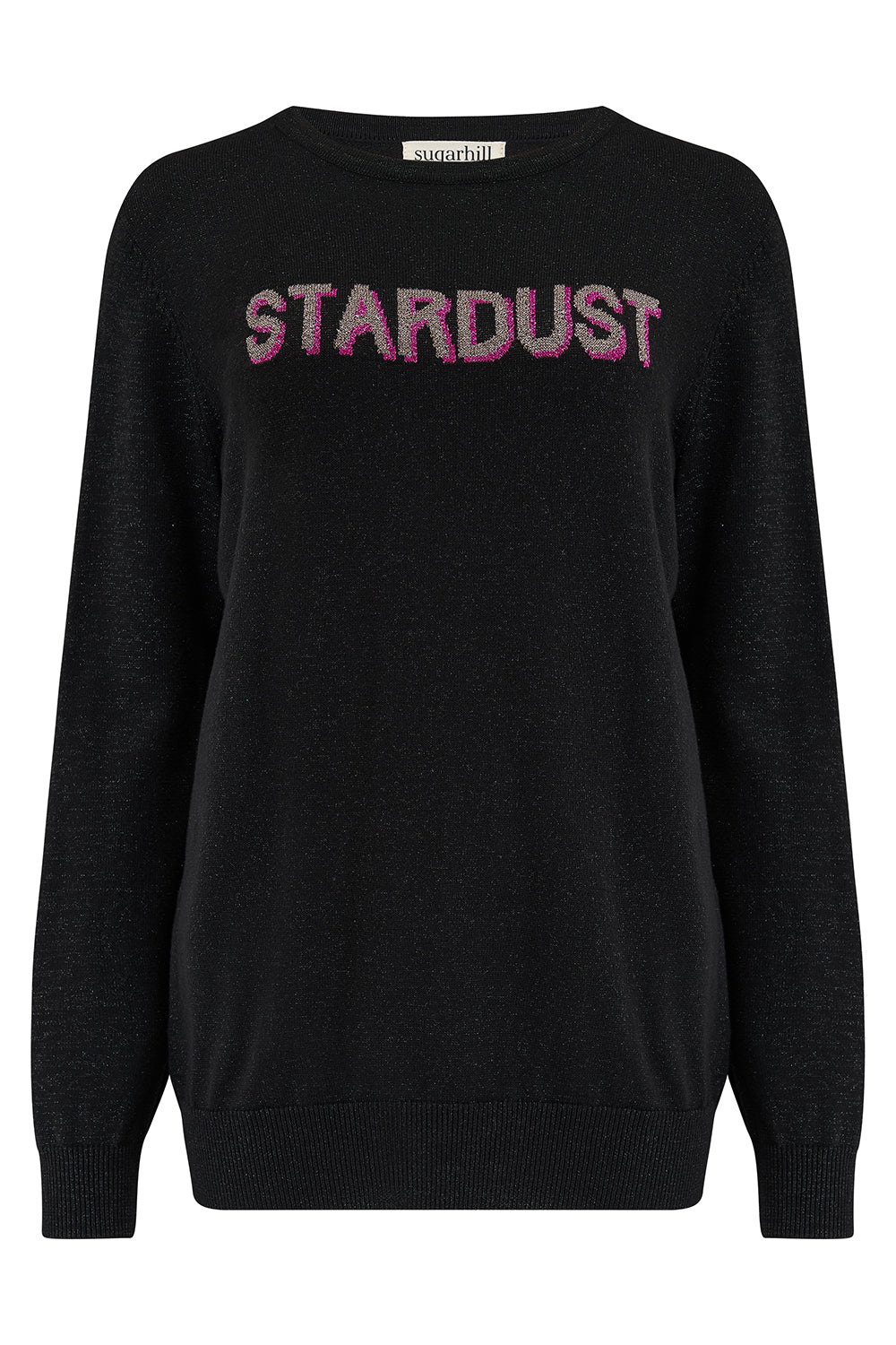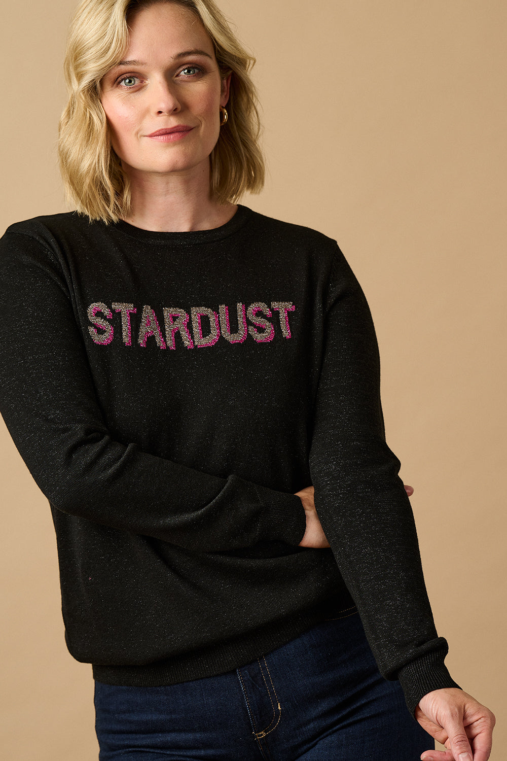 A woman wearing a long sleeve black jumper with the text 'STARDUST' on the front.