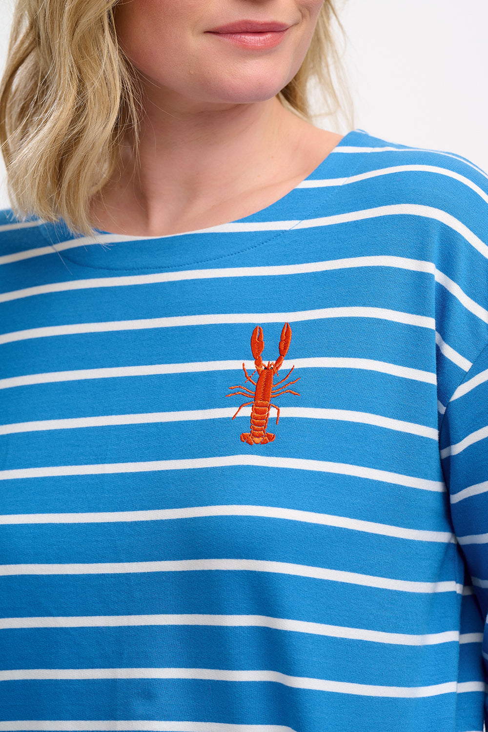 Sail into effortless style with the Billie Breton Top, crafted from soft 100% Organic Cotton for all-day comfort. Inspired by our bestselling Brighton Breton, this updated design features a boxy, relaxed fit and classic nautical thin white stripes on a fresh cornflower blue base. A charming embroidered lobster motif adds a playful coastal touch, making it the perfect piece for laid-back weekends, seaside strolls, or casual everyday wear.