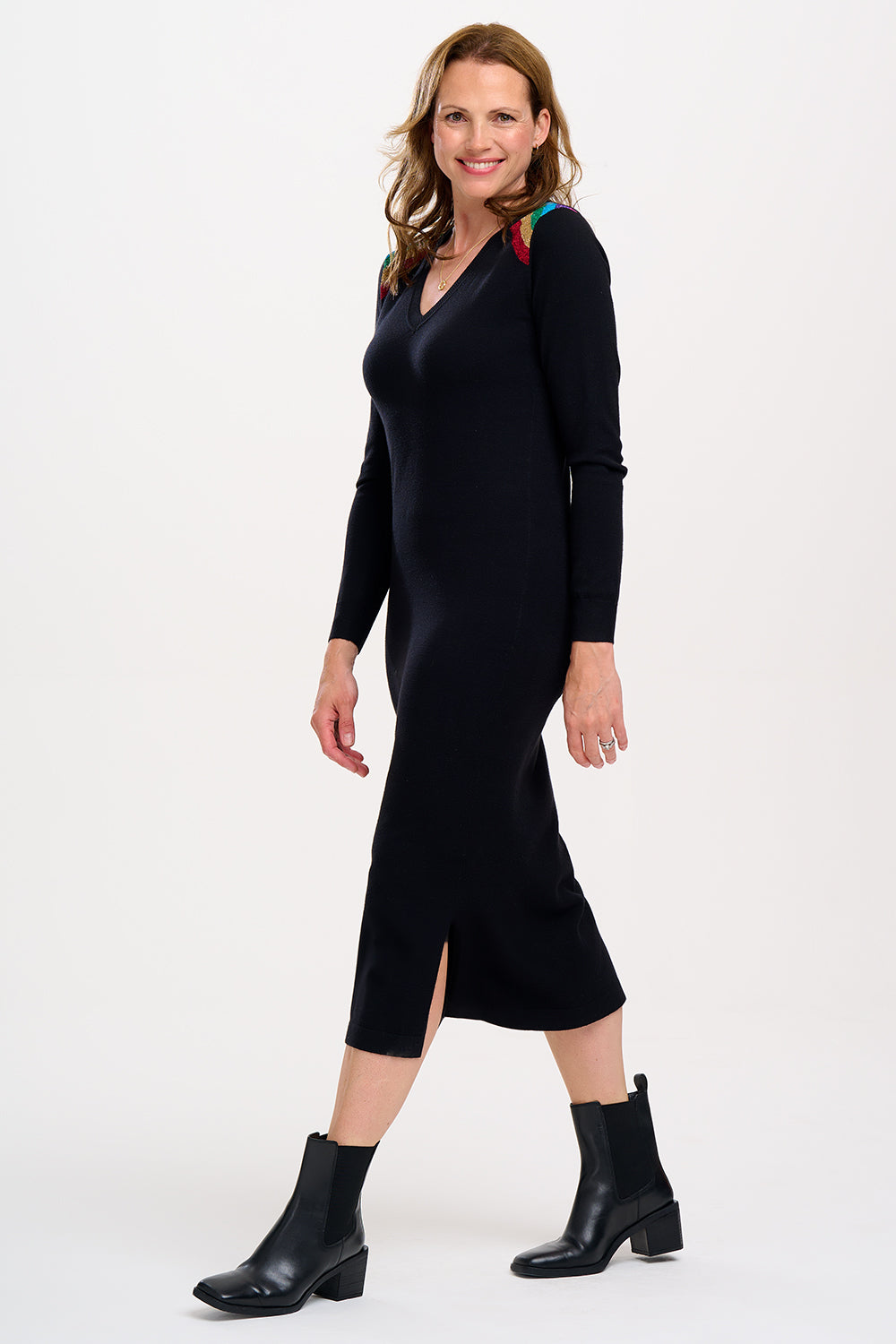 A model wearing a long-sleeved black knit midi dress with a V-neck and a sparkle prism detail on the shoulders, paired with black boots.