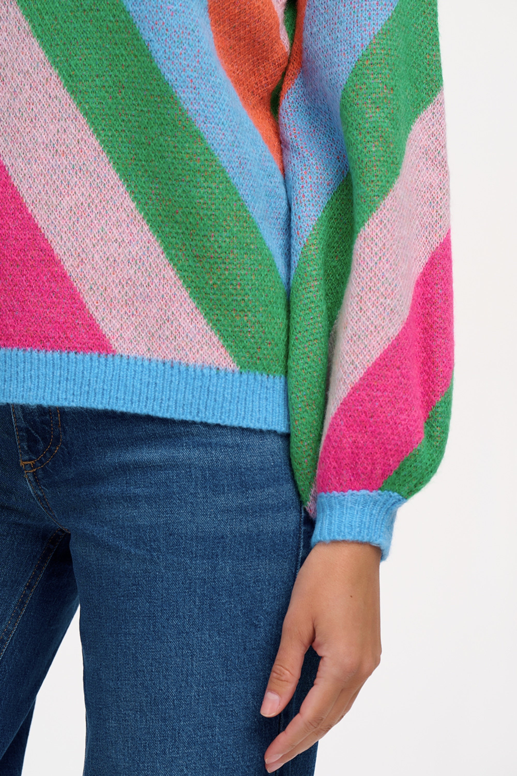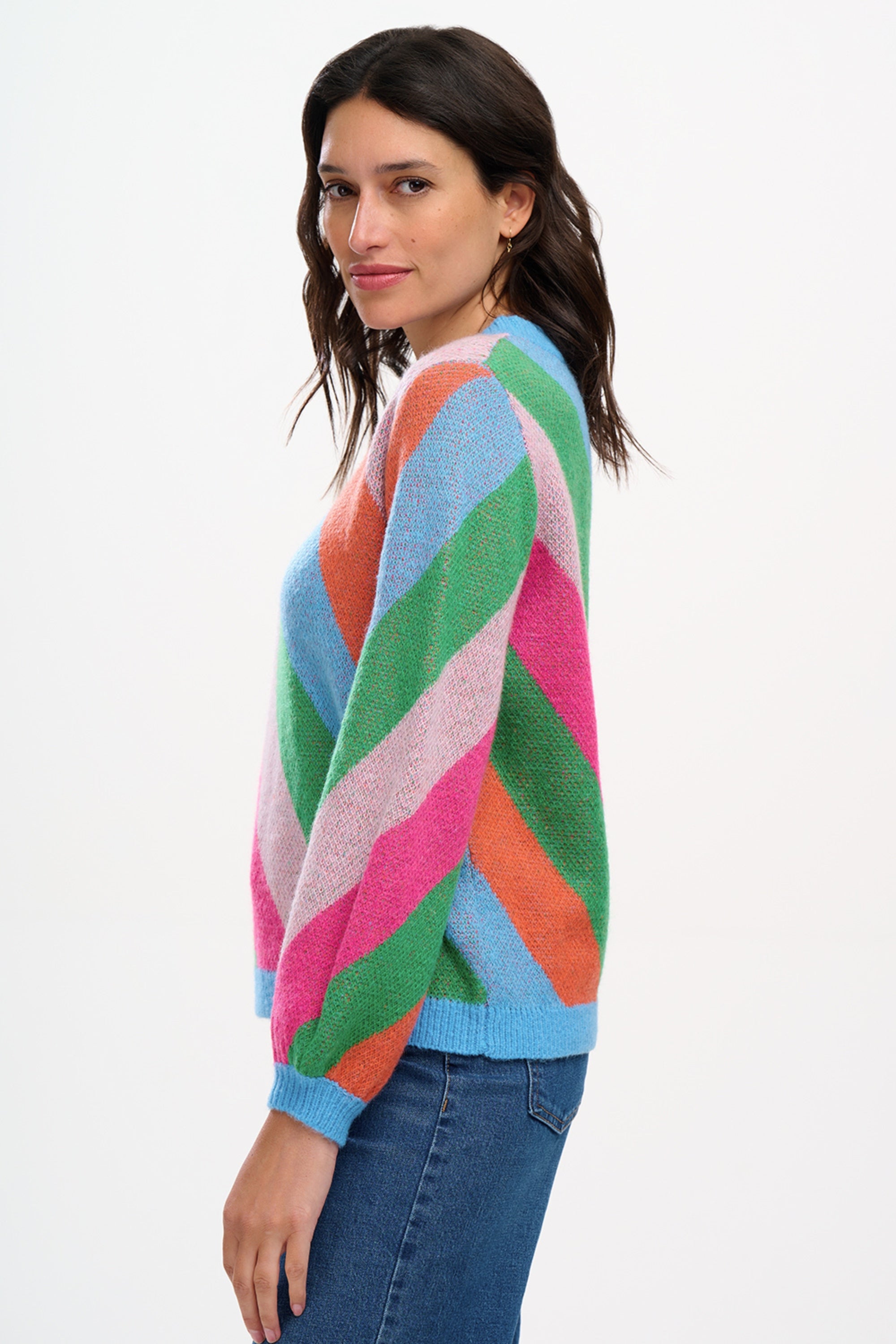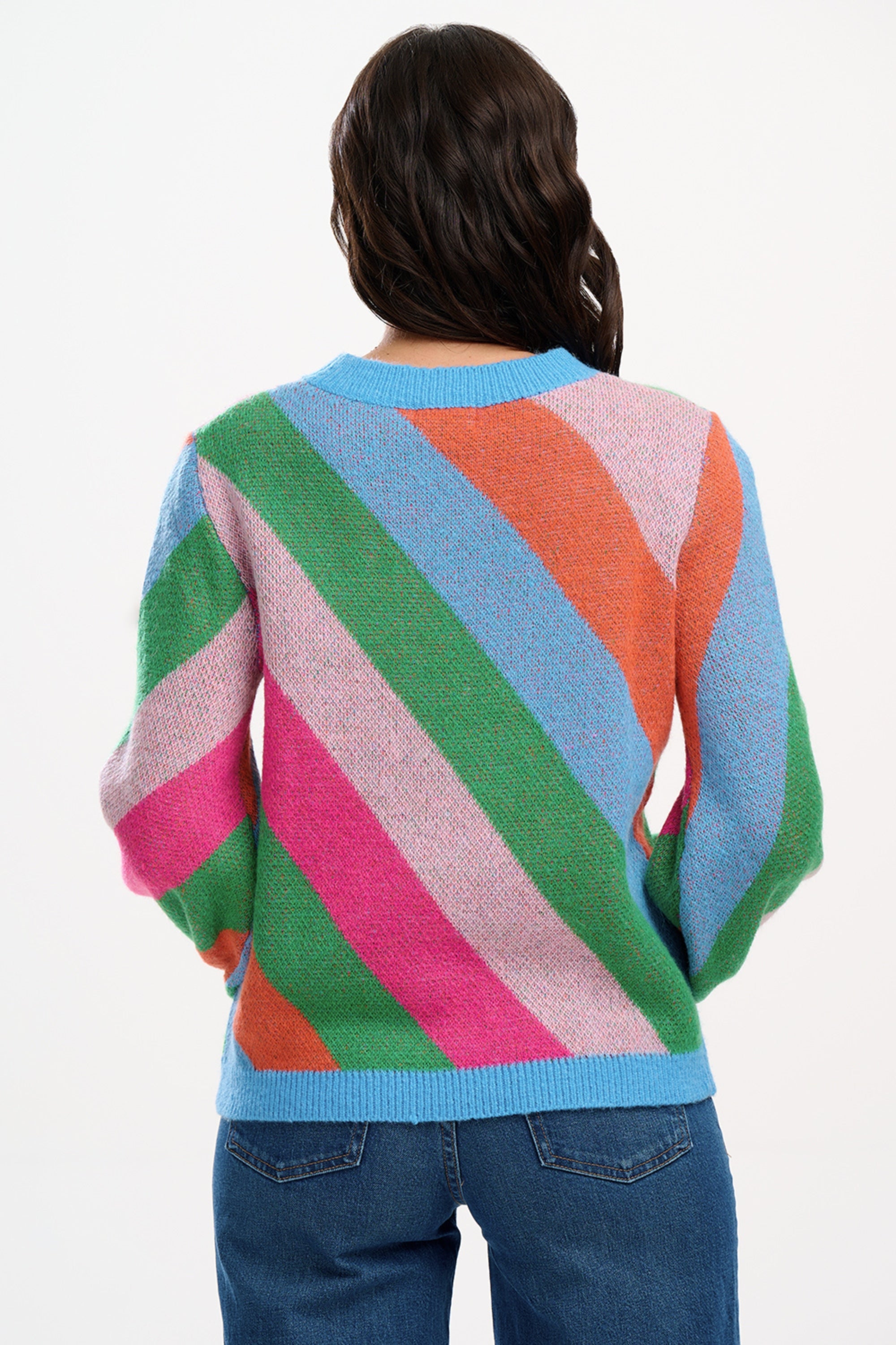 The Essie Jumper brings colour and comfort to your everyday wardrobe. With its relaxed fit, ribbed collar and cuffs, and statement blouson sleeves, this knit offers both style and cosiness. Crafted from thicker textured yarn, it has a slightly shorter length for a flattering, modern finish. The vibrant pink, orange, green, and blue pattern ensures it stands out as a playful yet versatile layering piece.