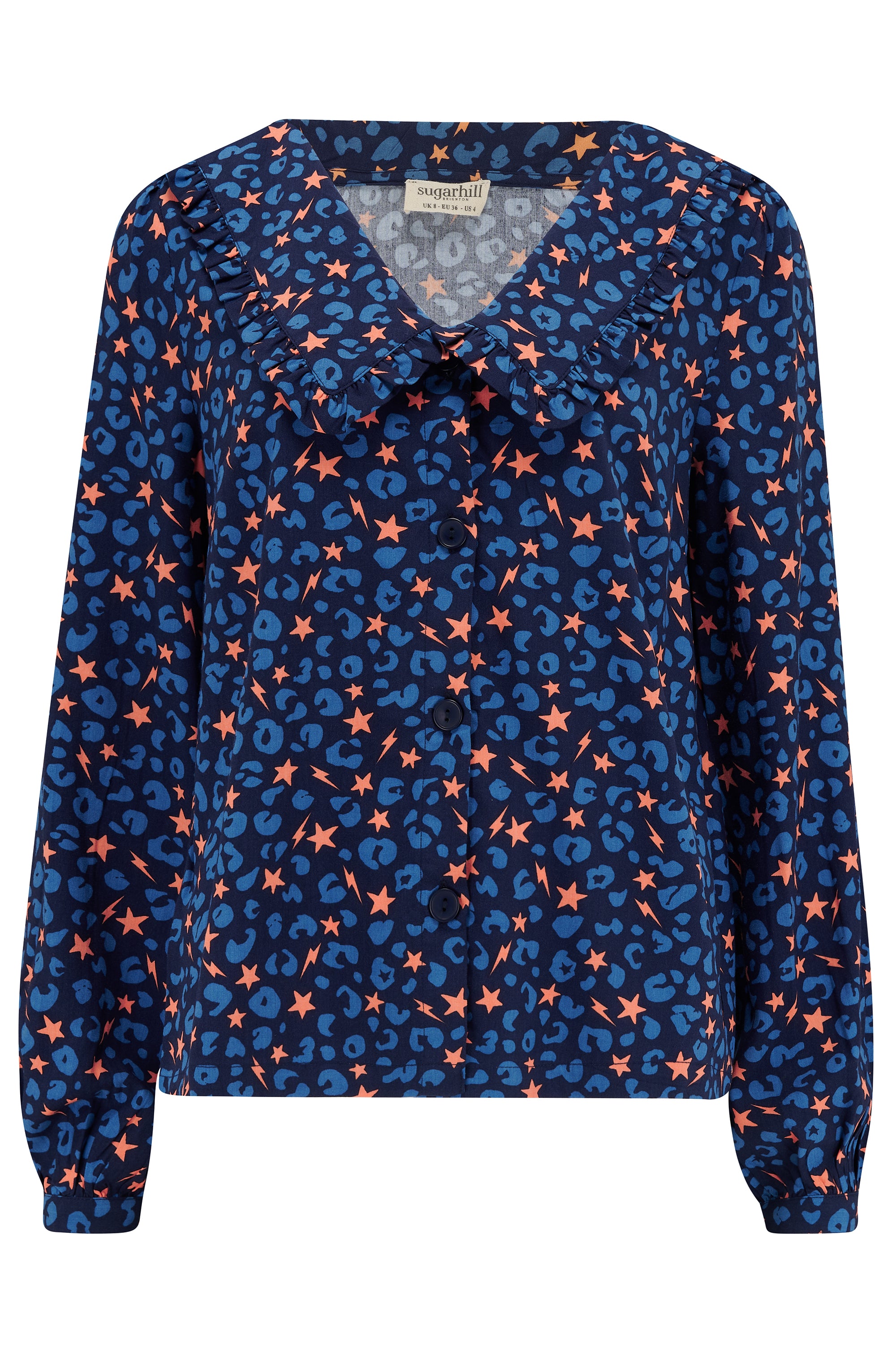 The Henna Frill Blouse combines vintage-inspired charm with a playful modern print. Cut in a boxy, relaxed fit, this blouse features long blouson sleeves with comfortable cuffs, a functional button front, and an oversized frill-edge collar that makes a statement. The Star Lightning Animal print mixes a bold blue leopard pattern on a deep navy base, scattered with lightning bolts and stars in soft coral orange, creating a vibrant, eye-catching design. Pair with jeans or skirts for an effortlessly stylish look.
