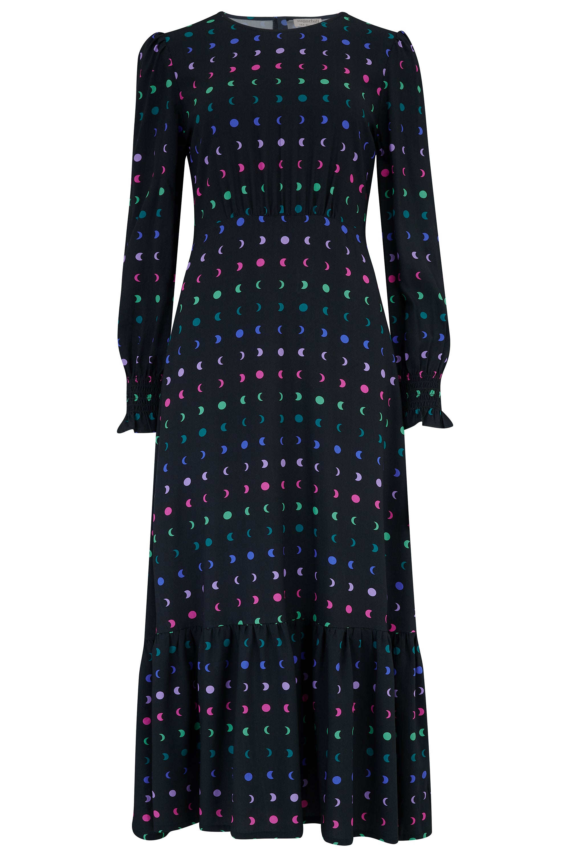 A full-length sister to our beloved Amelie shape, the Isabella Maxi Dress embodies timeless feminine charm. Designed with a flattering curved waistline and a full, tiered skirt, this tea dress creates effortless movement with every step. It features a round neckline, subtle puff shoulders, and long sleeves finished with shirred elasticated cuffs and delicate frill details. The hand-illustrated Moon Phases print features a mixed jewel toned lunar cycle stripe on a black base.