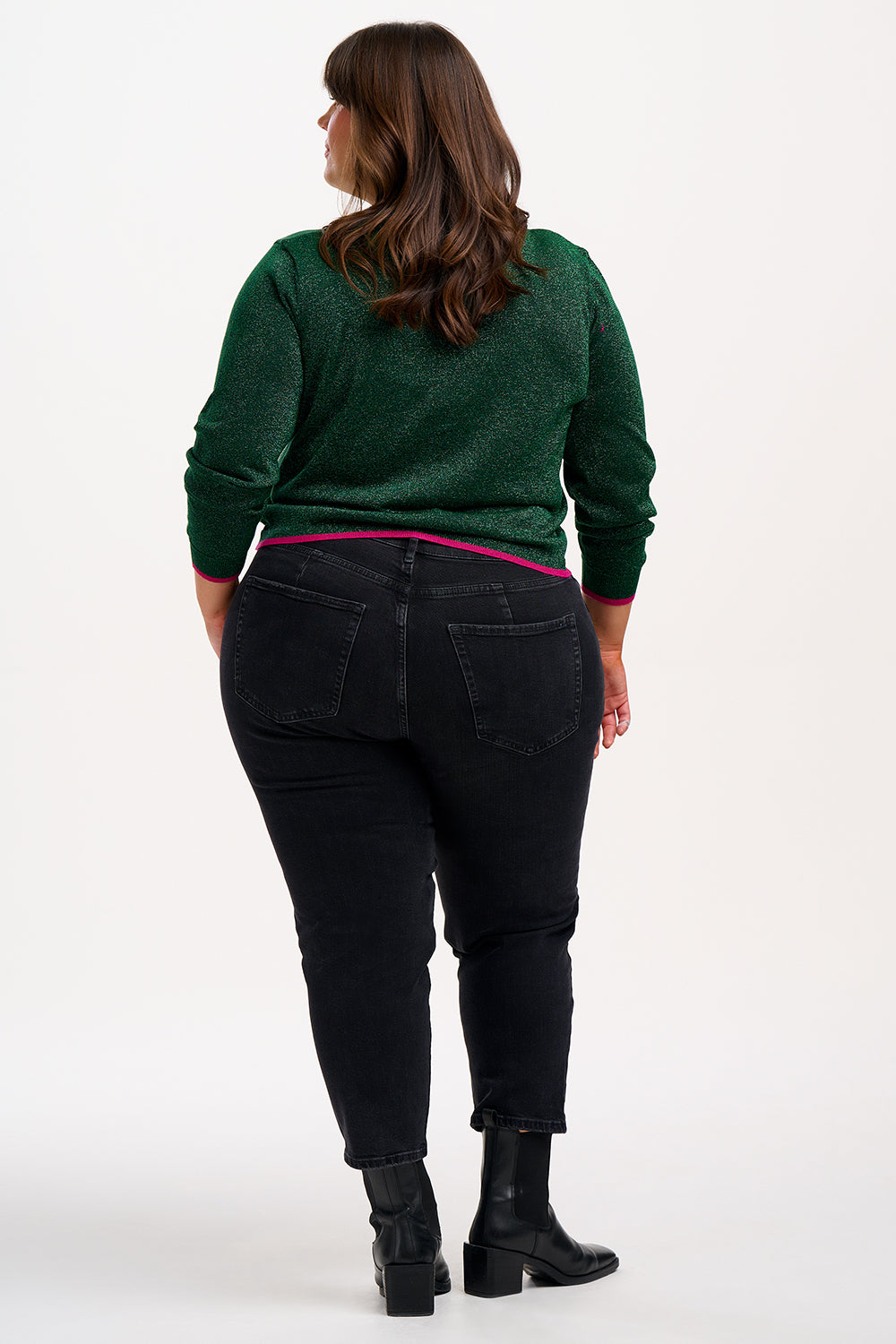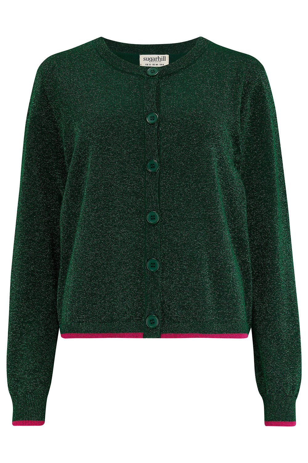The Ophilia Cardigan combines timeless elegance with a touch of sparkle. Crafted with metallic fibers, this slim-fit design flatters the silhouette while offering versatile styling. Featuring a round neckline, ribbed cuffs, and a neat button front, it’s finished with subtle pink tipping at the cuffs and hem for added charm. Wear it buttoned up as a sleek round-neck jumper, or layer it open over your favorite tee for an effortlessly chic look.