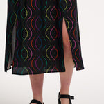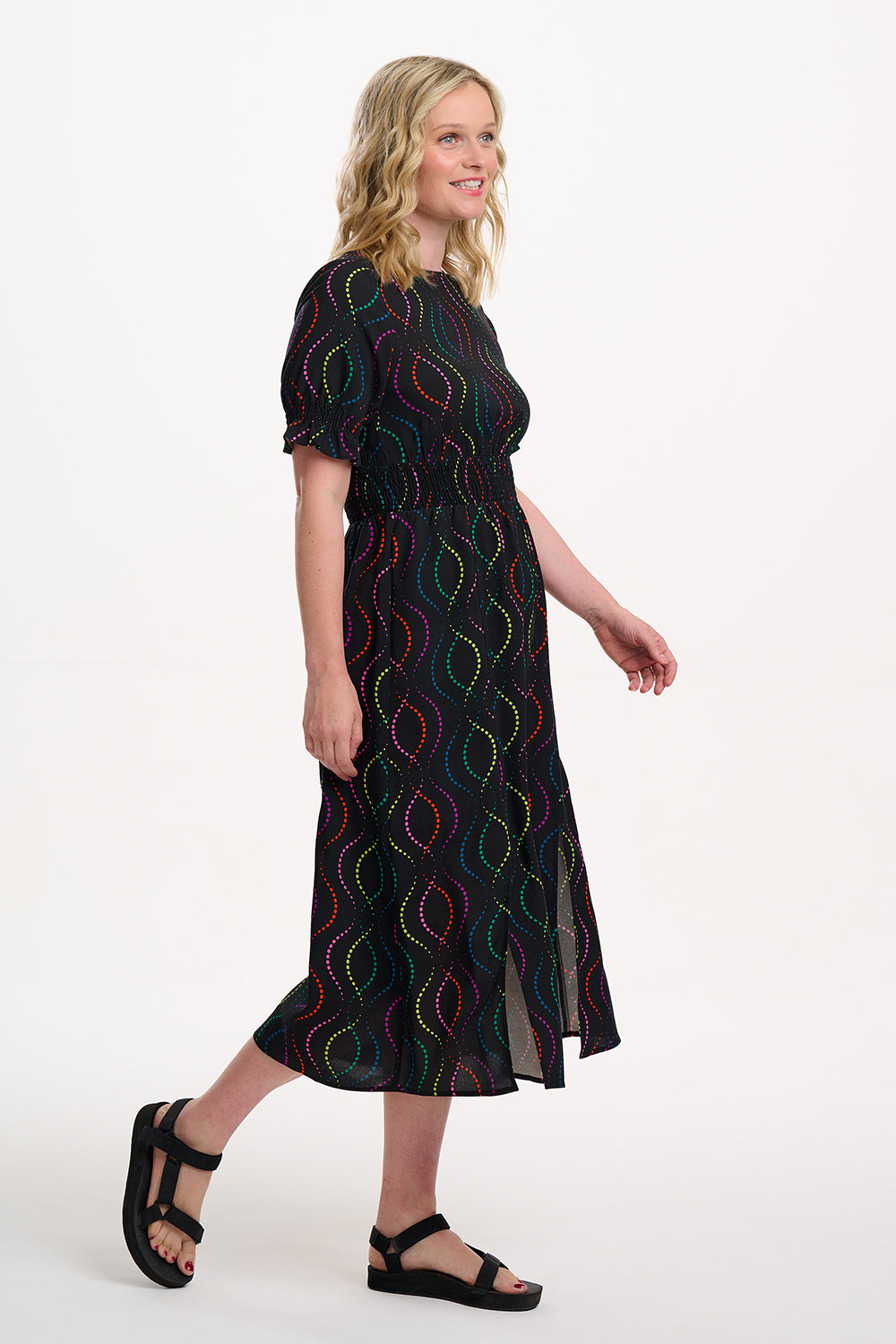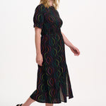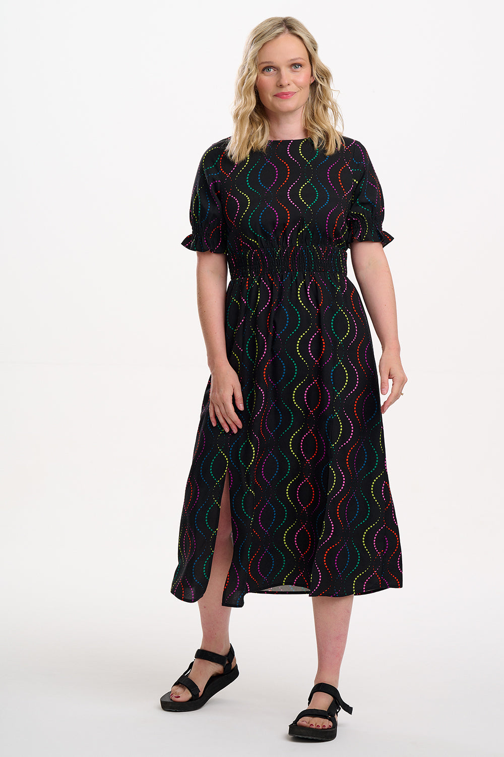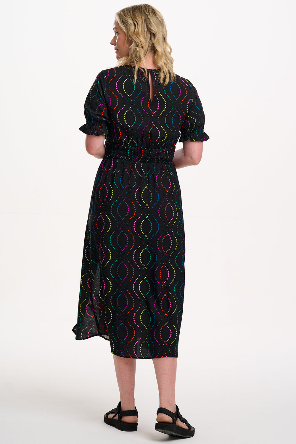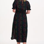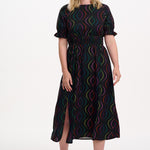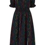 Say hello to Lindsey – your new go-to all-rounder dress that does it all. With flattering shirring at the waist and cuffs, pretty puff sleeves finished with a frill, and a floaty skirt with two side slits, she’s got comfort and drama in perfect balance. And the print? We’re in love. The Black Dotted Waves design features rainbow dots forming playful, wavy lines on a bold black base. Eye-catching, fun, and endlessly wearable – this puff sleeve midi dress is ready for anything from brunch to the dance floor.