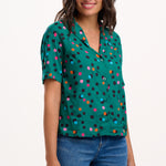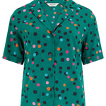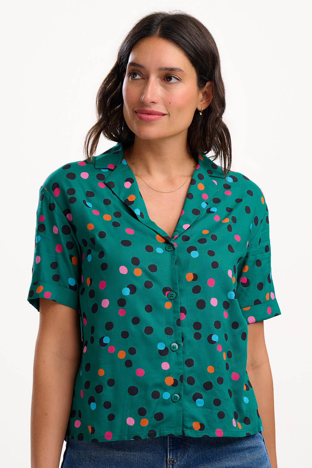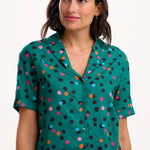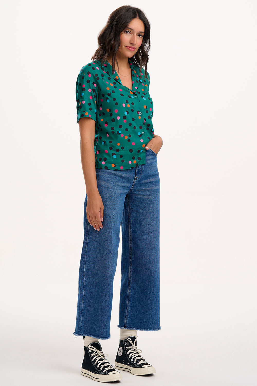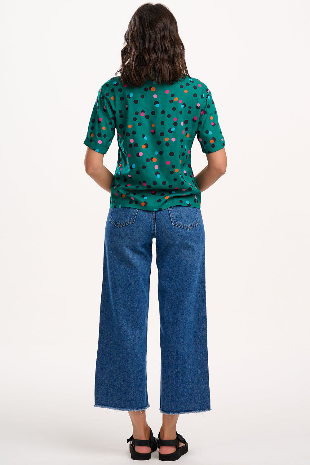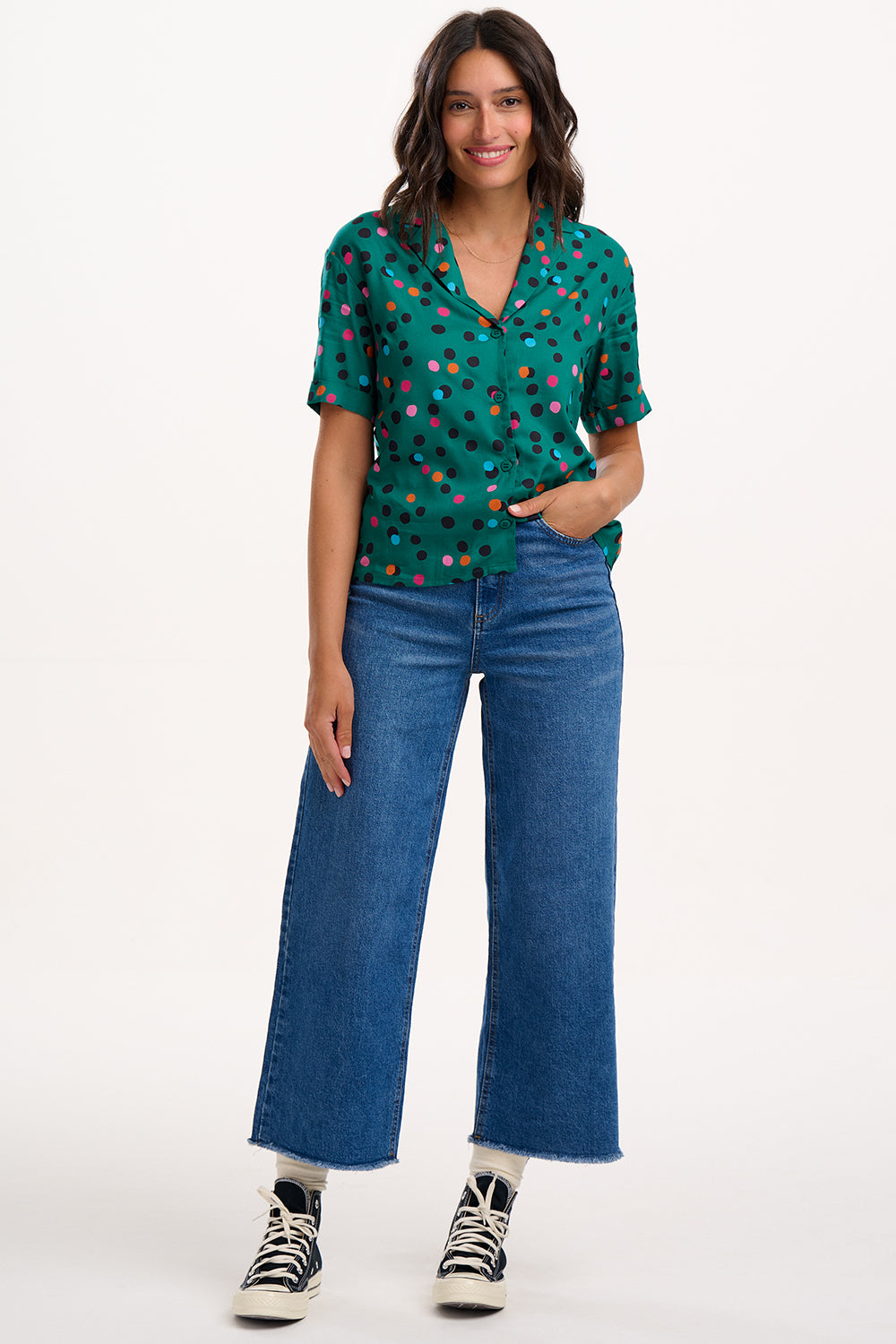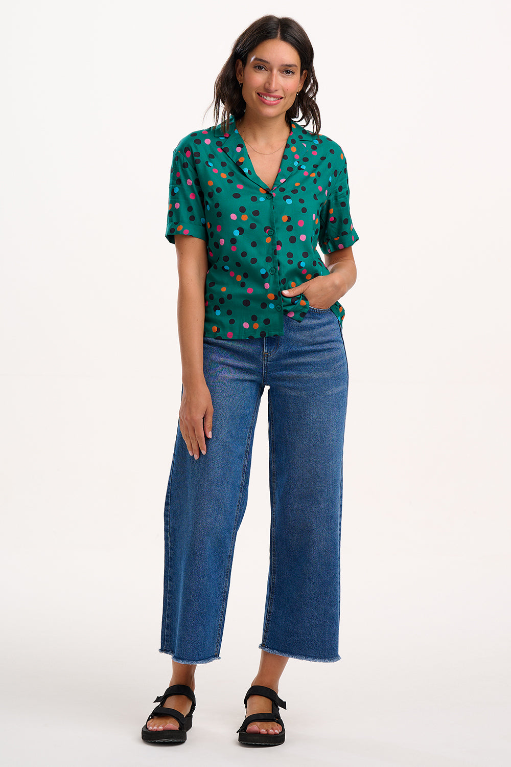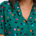 Say hello to the Odele – our fresh twist on the bestselling Hatty Shirt. Cropped to sit just above the hip, this playful short-sleeve shirt features a relaxed revere collar, turned-back cuffs, and a functional button-up front for easy styling. It’s breezy, modern, and super flattering. Finished in our bold Layered Spots print – a striking mix of black, pink, blue, and orange on deep green – Odele adds instant colour and cool to your everyday look.