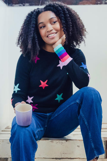 Meet your new go-to layer: the bestselling Rita Jumper is back – and cuter than ever. With its lightweight cotton-mix feel, comfy crew neck, and flattering mid-hip length, it’s made for throwing on and heading out. The real mood booster? That playful bold stars in pink, red, aqua and green on a black base with stripes to the cuff. It’s fun, bold, and totally wearable – basically, a colourful knit that does all the talking. The perfect pick-me-up for your wardrobe!