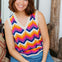 New for 2025, the Rosy Knit Vest is a V-neck sleeveless top with wavey hems and pointelle detailing. Inspired by the SoCal summers of the 70s. Featuring a chevron design in orange, red, pink, lilac and teal. Pair with your fave denim for a perfectly casual outfit.