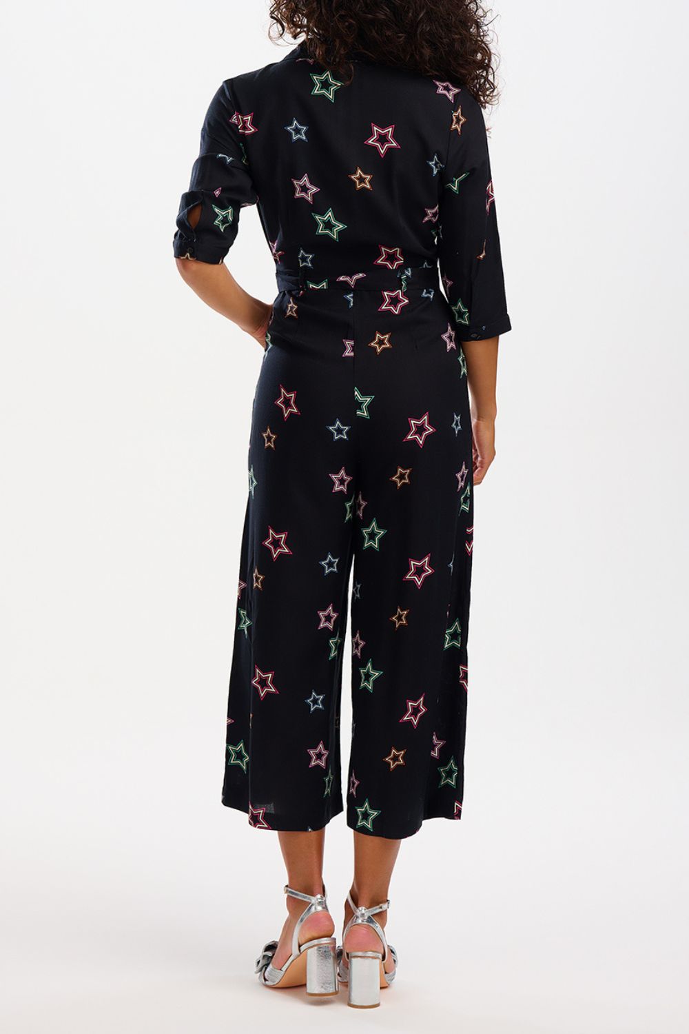 The Rylee has a fitted revere collar upper, half-length sleeves, a nipped in waist with a tie belt and wide leg cropped trousers. The Rylee showcases our Rainbow Stars print fabric, with scattered star outlines in green, red and pink on a black base. The Rainbow Stars print features white scattered stars of varying sizes, outlined in jewel shades of berry, emerald, mustard, and blue on a black base. LENZING™ ECOVERO™ Viscose fabric is sustainable, lightweight and breathable, meaning you can wear it all day in comfort.