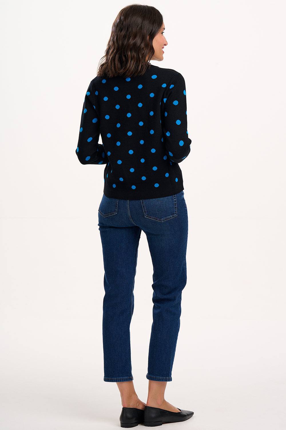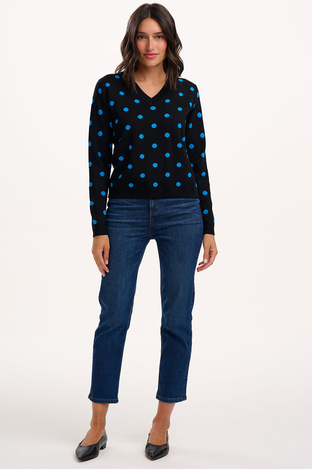 Samira V-Neck Jumper is a playful twist on a timeless knit. Cut in a flattering V-neck shape with a classic fit, this jumper combines comfort with everyday style. The bold blue polka dot print on a black base adds a fun, modern edge, making it the perfect layering piece for work, weekends, or casual evenings