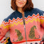 The Solana Knitted Bomber Jacket is a playful yet versatile knit designed with a relaxed fit and a centre zip fastening for easy layering. Crafted in a soft knit, it brings a casual edge to any outfit, perfect for throwing over tees and pairing with jeans. Two stylised leopards flank a palm tree beneath bold zigzag stripes, creating a vibrant, exotic, retro-inspired scene that makes this bomber a true statement piece that’s both cosy and stylish.