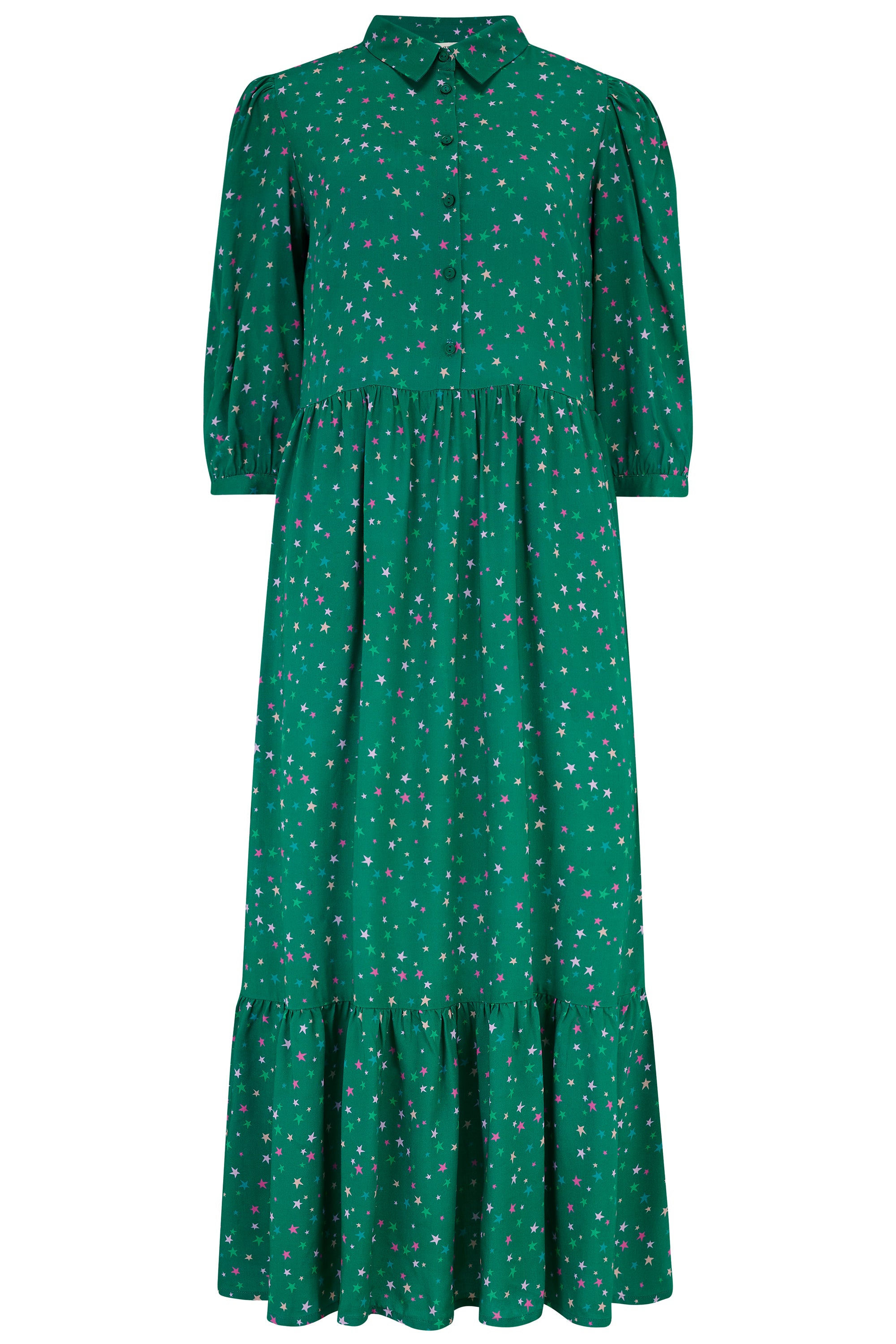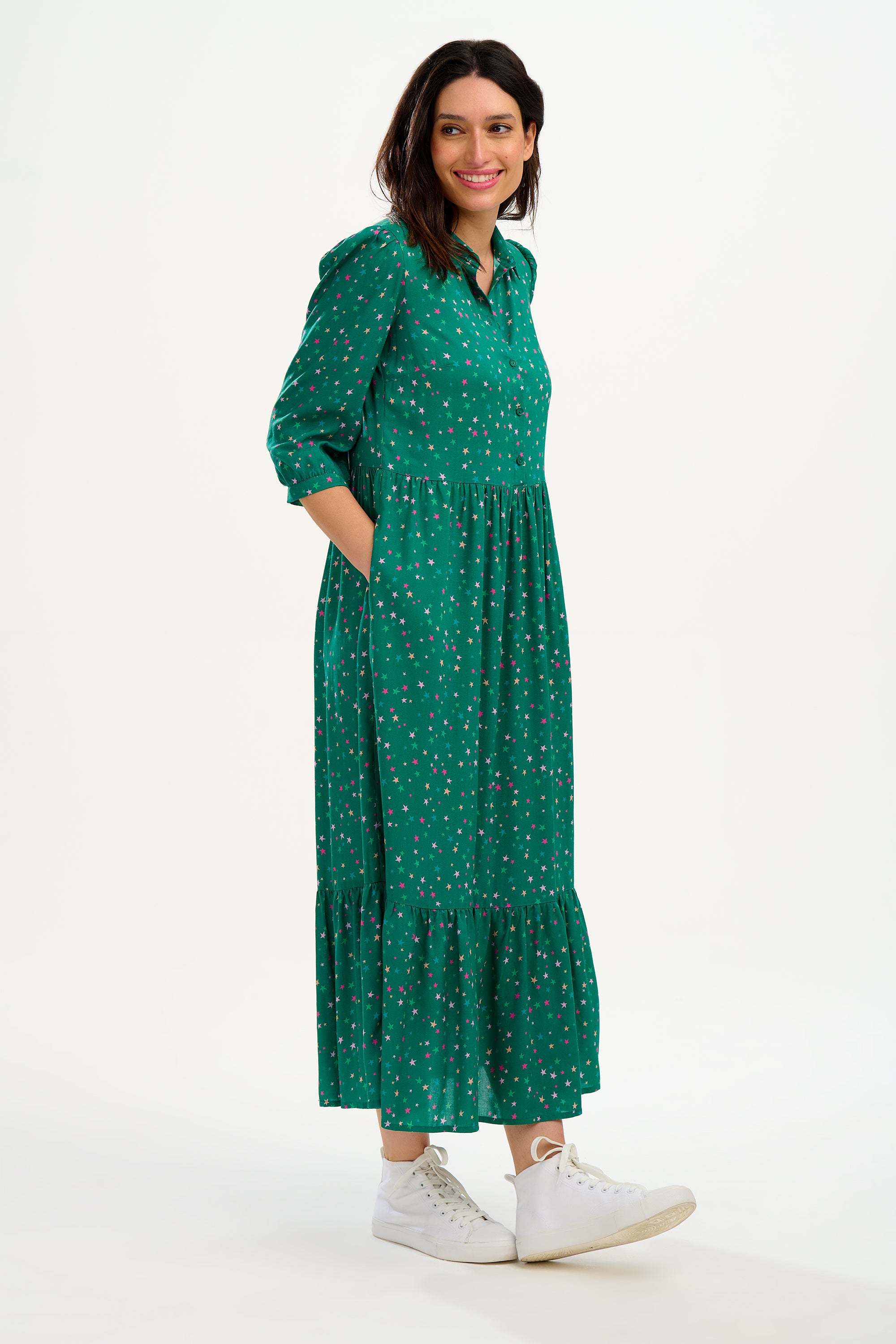 The relaxed Sutton shape combines a classic shirtdress upper with ALL of our favourite features from our maxi smock dress styles. A button-up front, shirt collar, puff shoulders, 3/4 length sleeves and a maxi length tiered skirt and those all-important pockets. There's a lot to love. The new Micro Star Confetti print features scattered pale green, blue and hot pink mini stars on a jewel green base. LENZING™ ECOVERO™ Viscose fabric is sustainable, lightweight and breathable, meaning you can wear it all day in comfort.