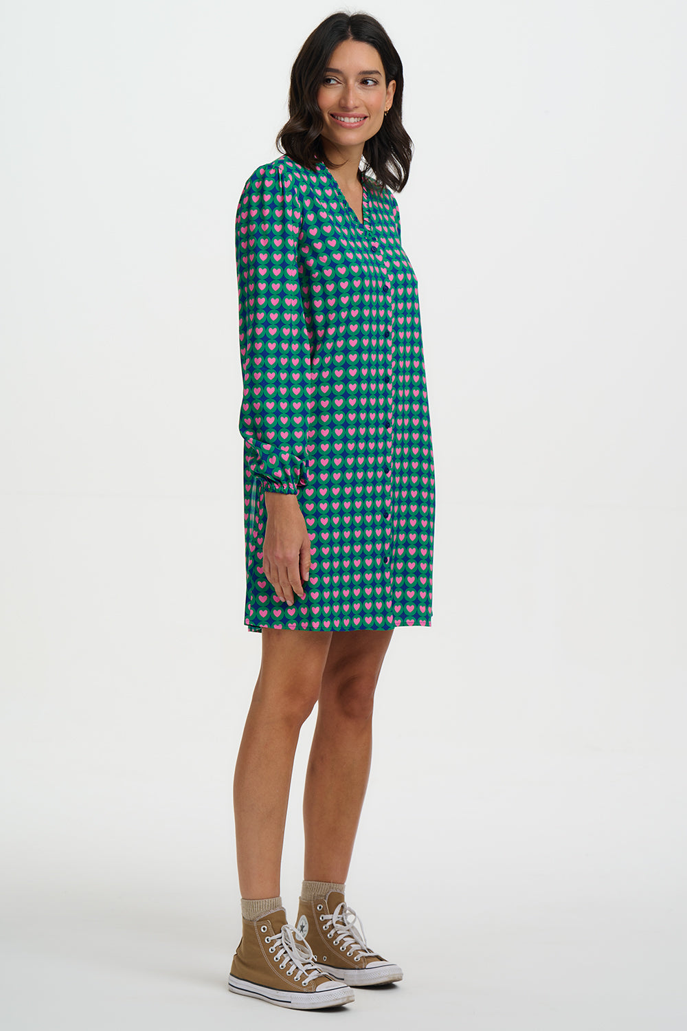 The Taylyn Dress is a fun, easy-to-wear mini with a relaxed silhouette and playful retro charm. Designed with a soft V-neckline, long sleeves with gentle gathers at the cuffs, and a flattering loose fit, it’s perfect for everyday styling. The bold all-over print of pink hearts set inside green circles on a navy base adds a joyful statement, ideal with trainers or boots.