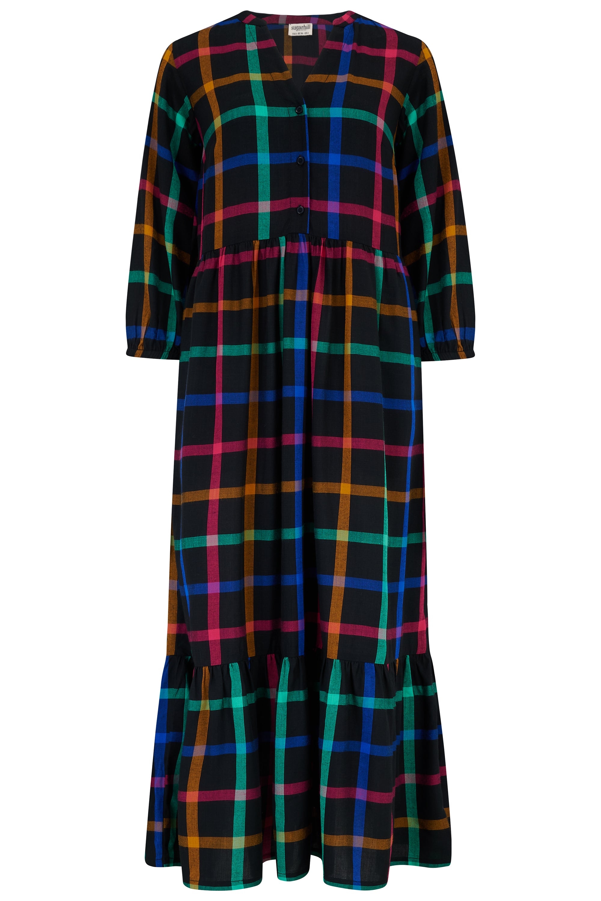 A dress to wear over and over, Heather is our new Summer favourite. Its new shape features an open neck, button front, ¾ sleeves and a full smock skirt with a deep frill hem and pockets. The Rainbow Check print is a stand out design, with a grid of squares made of lines in bright rainbow colours, including magenta, mustard teal and blue on a black base.