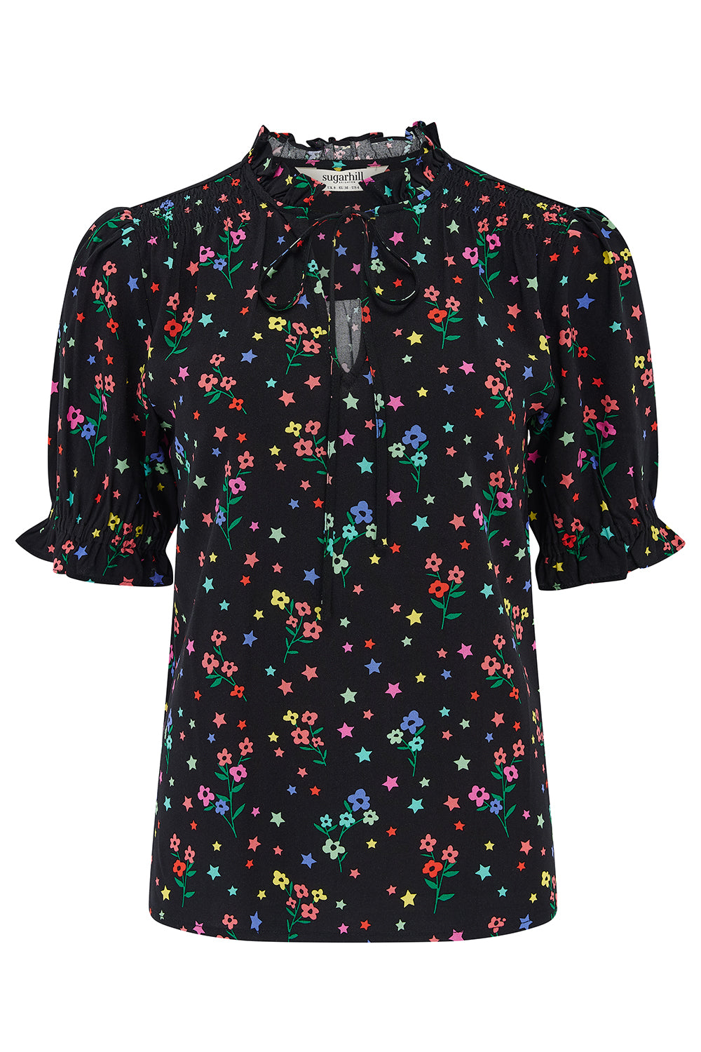 The Virginia Top offers effortless elegance with playful detailing. Inspired by our bestselling Angelique style, this blouse features delicate shirring at the shoulders, a frill collar, and a flattering v-neckline with adjustable ties. Short sleeves are finished with shirred frill cuffs for a feminine touch. Showcasing our playful Rainbow Sprigs print in bright red, yellow, green, pink and blue on a contrasting black base, it’s a versatile piece that pairs beautifully with jeans, skirts, or tailored trousers.