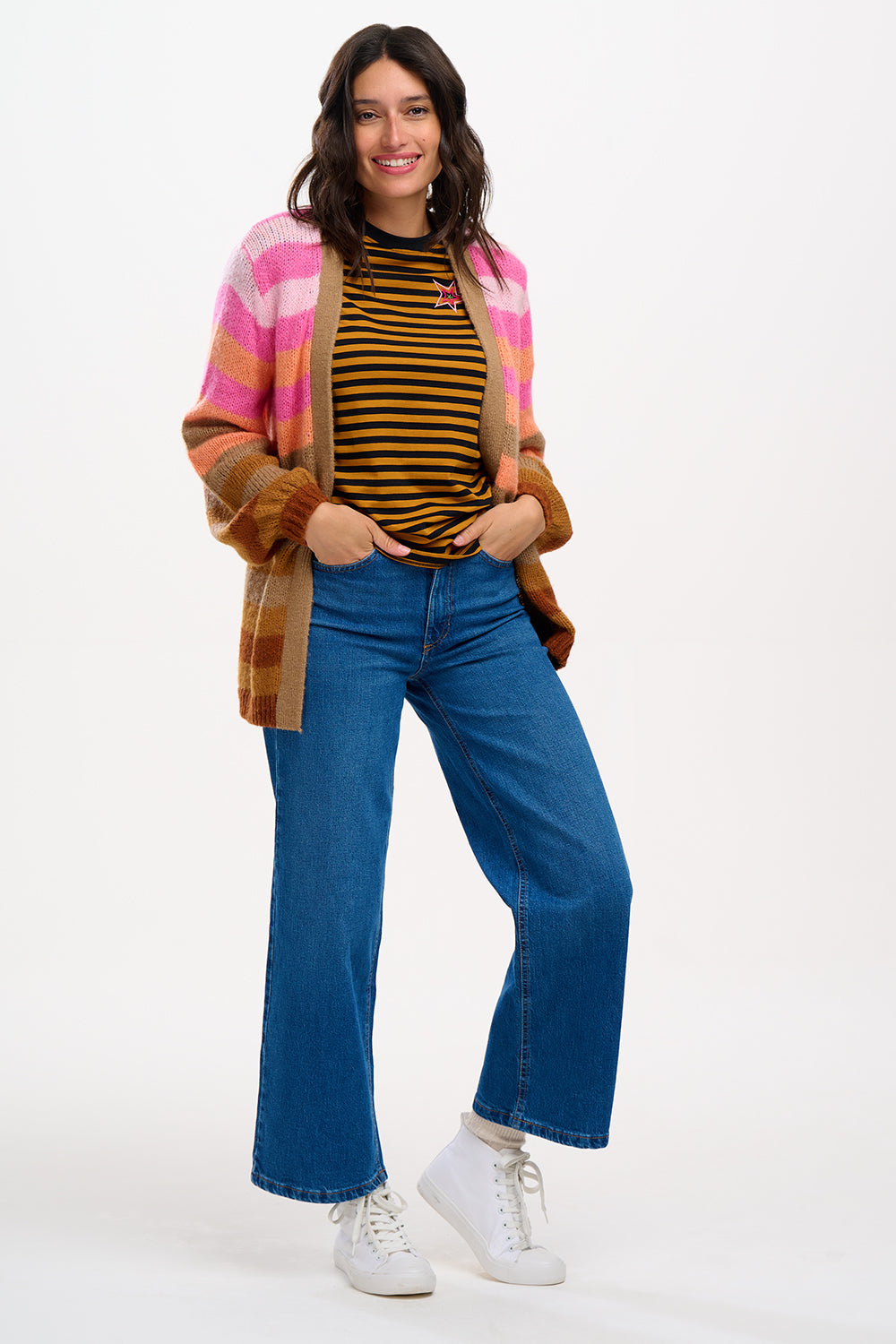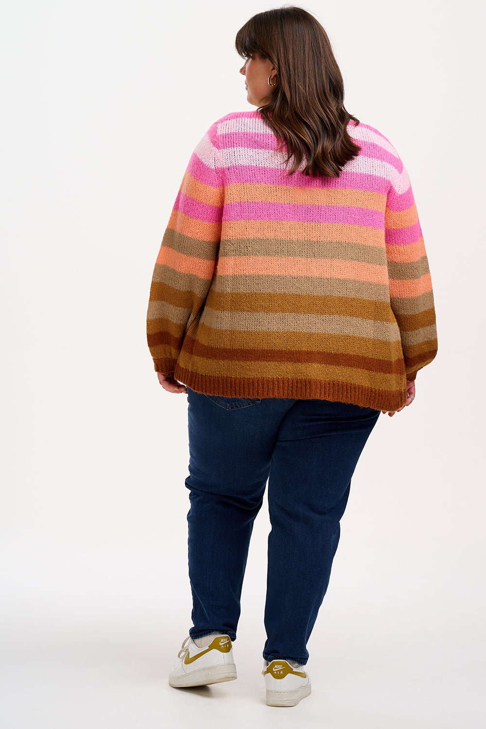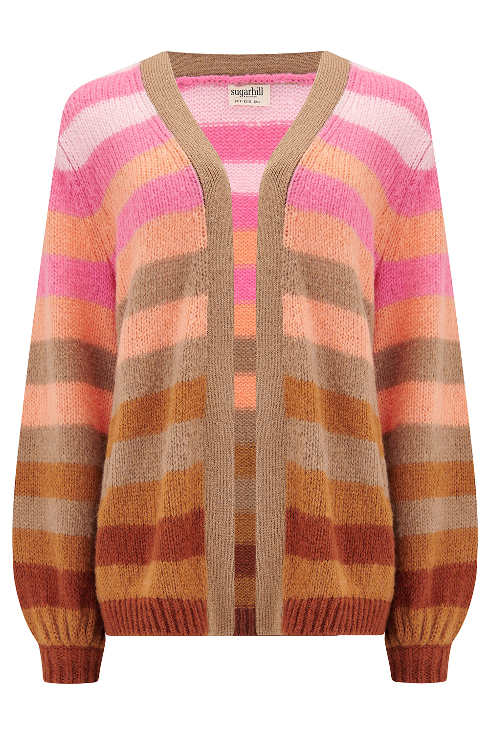 The Yvette Cardigan is designed with a flattering relaxed shape and statement blouson sleeves, making it a versatile layering piece. With no front fastenings, it drapes effortlessly and can be worn open as a cosy cardigan or styled as a lightweight jacket. Featuring multi Ombre stripe design has muted stripes of pale pink, baby pink, orange, tan and brown, this cardigan adds a playful yet chic touch to your wardrobe.